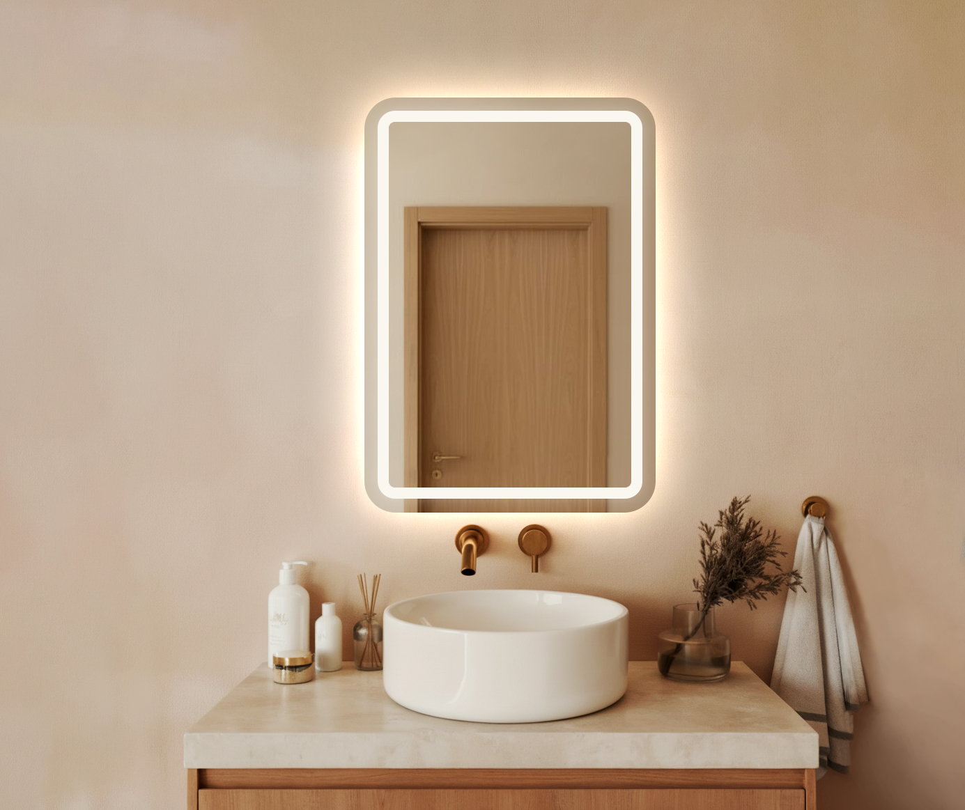 Tył lustra: standardowo niezabudowany – dzięki temu podświetlenie tworzy delikatną poświatę wokół tafli, dodając wnętrzu lekkości i elegancji.