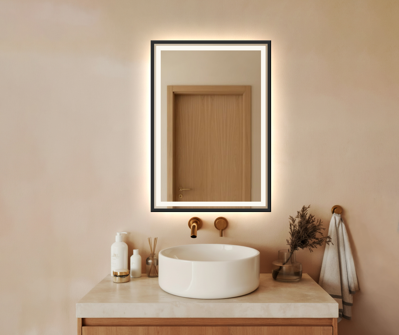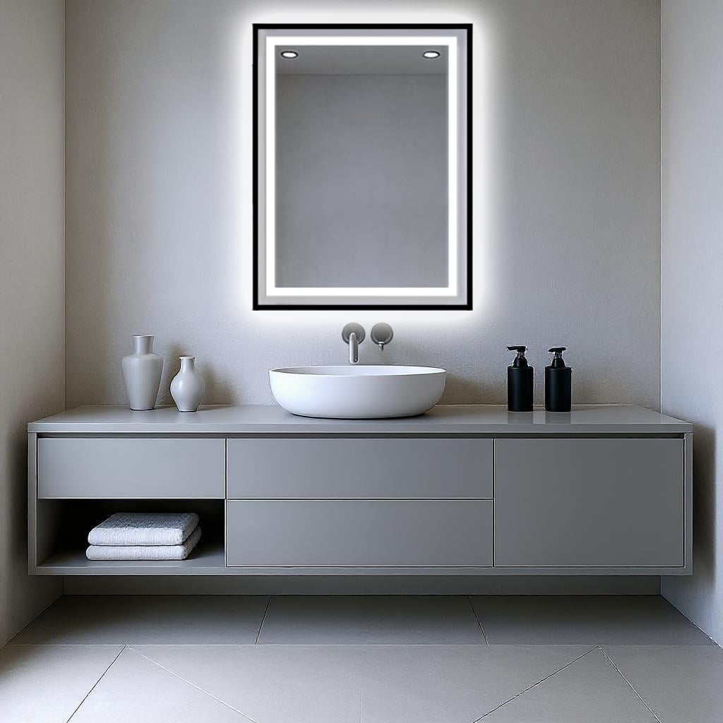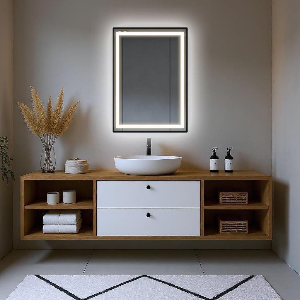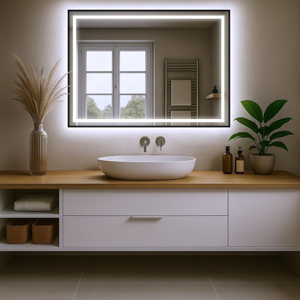 Tył lustra: standardowo niezabudowany – dzięki temu podświetlenie tworzy delikatną poświatę wokół tafli, dodając wnętrzu lekkości i elegancji.