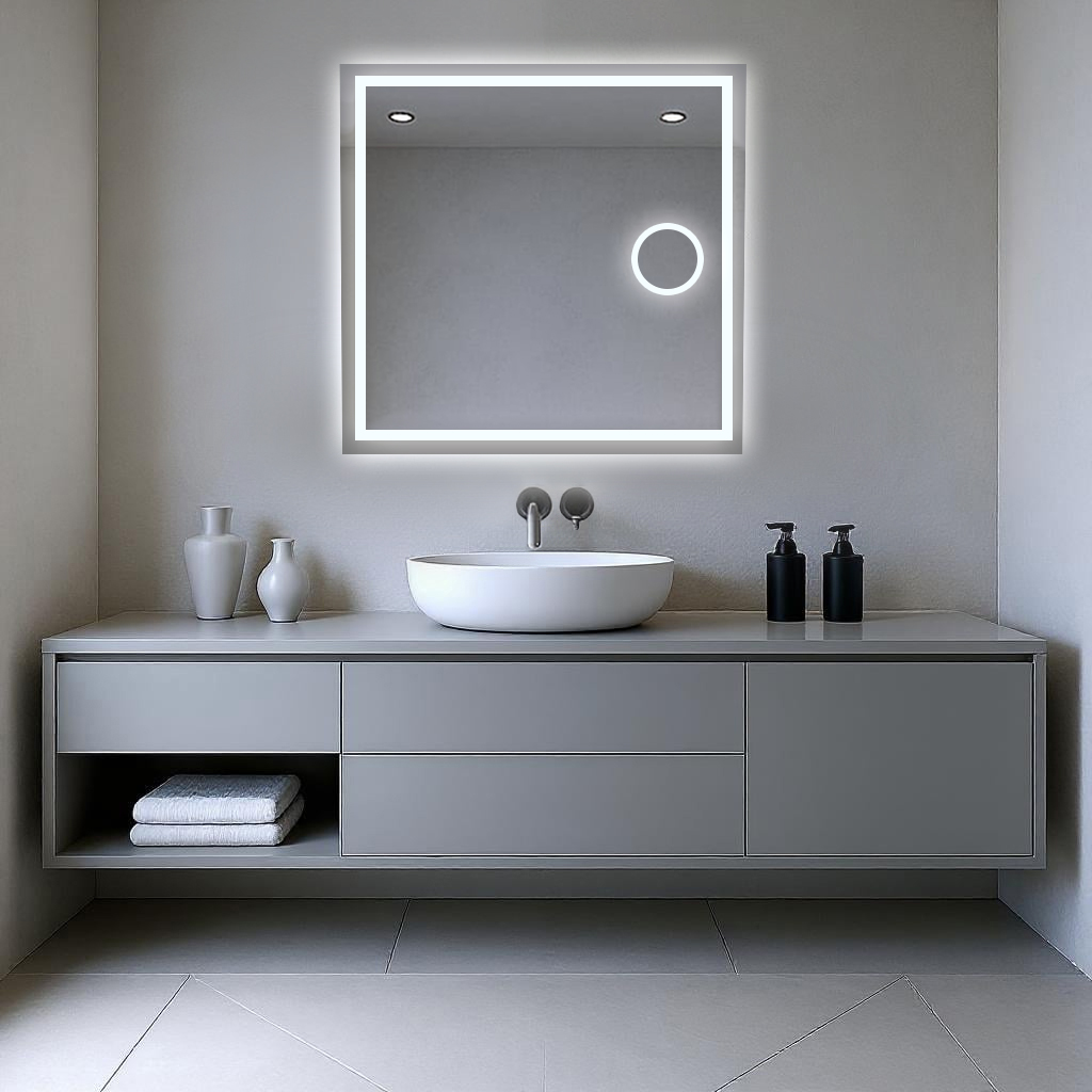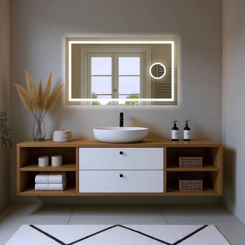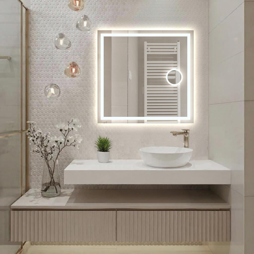 Rodzaj i grubość tafli szkła to najwyższej jakości francuska tafla SAINT GOBAIN 4mm, o jakości PREMIUM. Lustra zawierają podświetlenie LEDOWE – barwa do wyboru (Biała Ciepła 3000K / Biała Neutralna 4500K / Biała Zimna 6000K). Oświetlenie ma charakter dekoracyjny i nie zastąpi standardowego oświetlenia w pomieszczeniu.