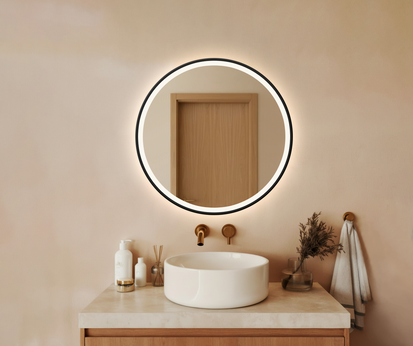 Tył lustra: standardowo niezabudowany – dzięki temu podświetlenie tworzy delikatną poświatę wokół tafli, dodając wnętrzu lekkości i elegancji.