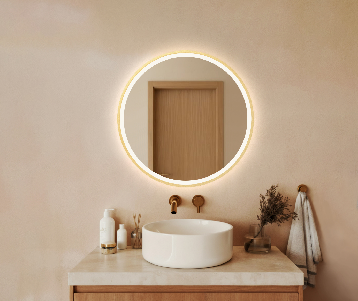 Model PREMIUM w złotej aluminiowej ramie to połączenie nowoczesnego designu z dekoracyjną funkcją światła. Subtelne piaskowanie tafli oraz zintegrowane podświetlenie LED tworzą elegancką poświatę, która podkreśla formę lustra i nadaje wnętrzu wyjątkowego charakteru.