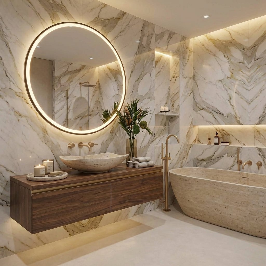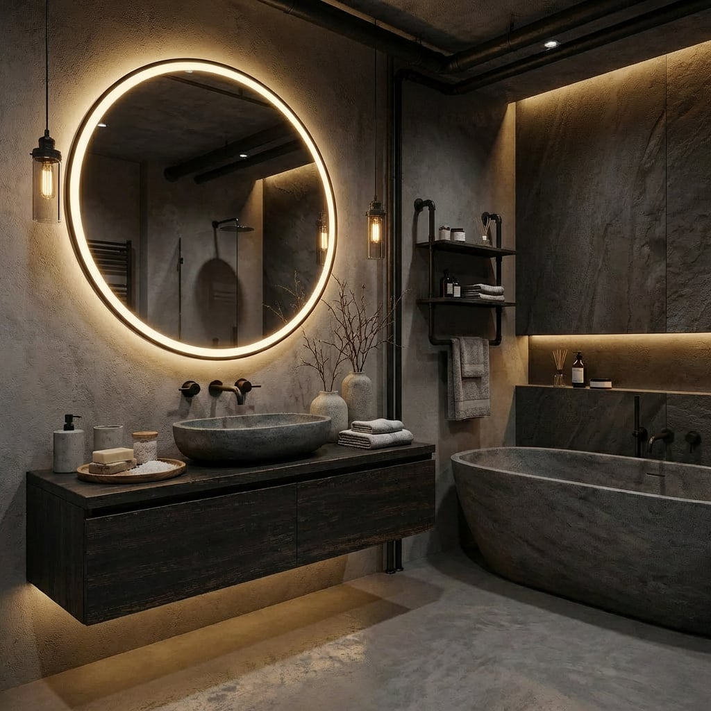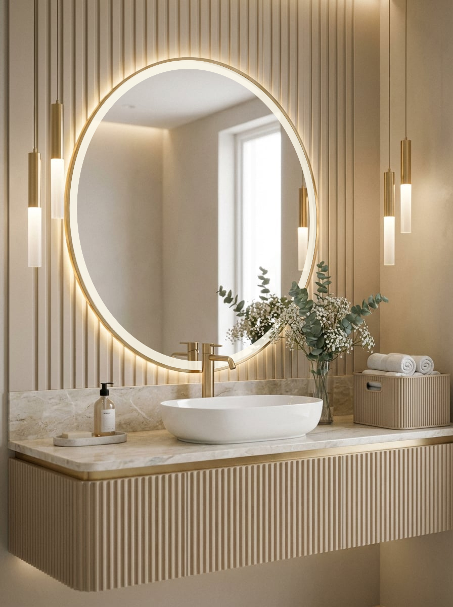 Dekoracyjne podświetlenie LED, widoczne dzięki precyzyjnemu piaskowaniu tafli, zapewnia miękkie i równomierne światło, które sprawdzi się zarówno podczas codziennych czynności, jak i jako nastrojowe dopełnienie wnętrza.