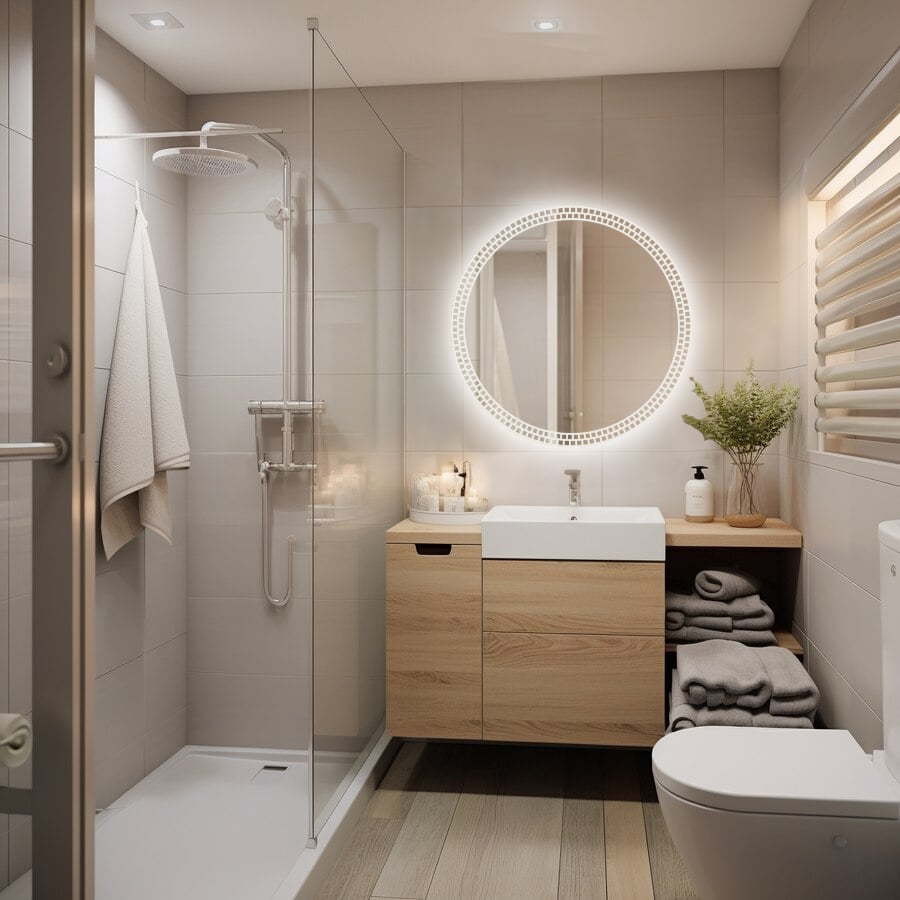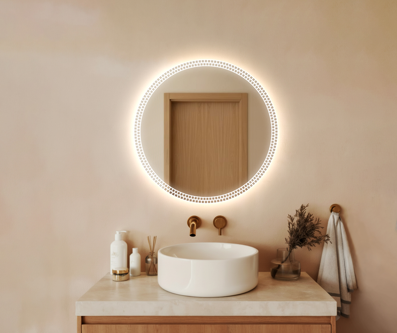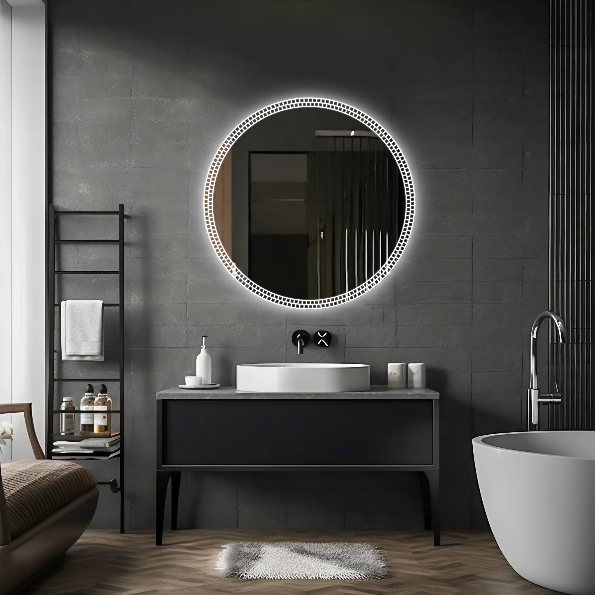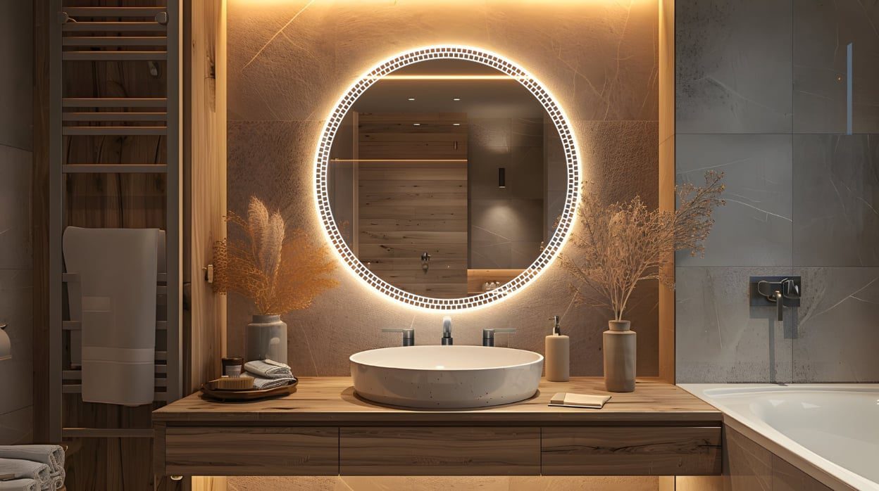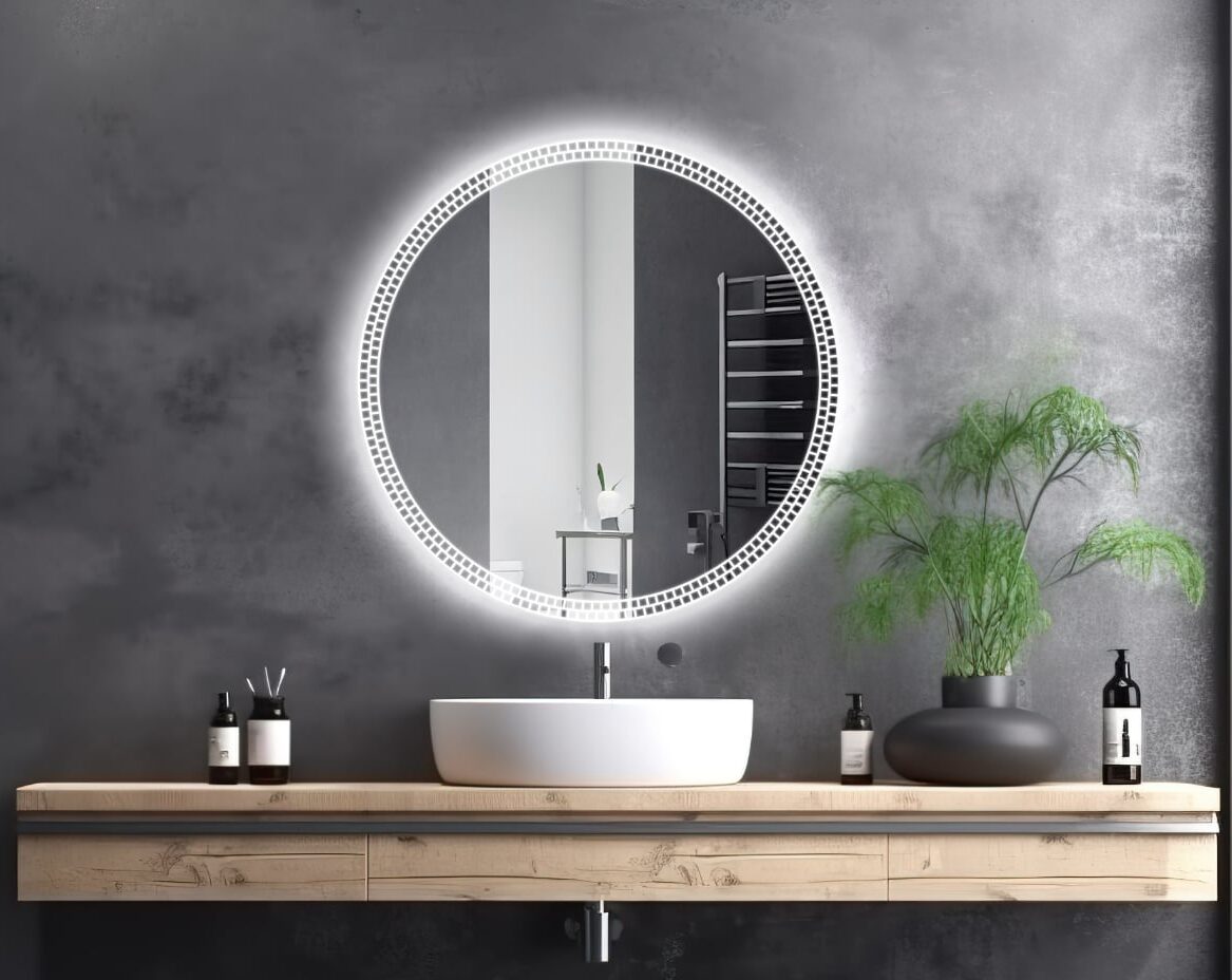 Nowoczesna, okrągła forma, subtelne piaskowanie oraz dekoracyjne podświetlenie LED tworzą wyjątkowy element wnętrza – idealny zarówno do łazienek, jak i przestronnych holi, sypialni czy garderób.