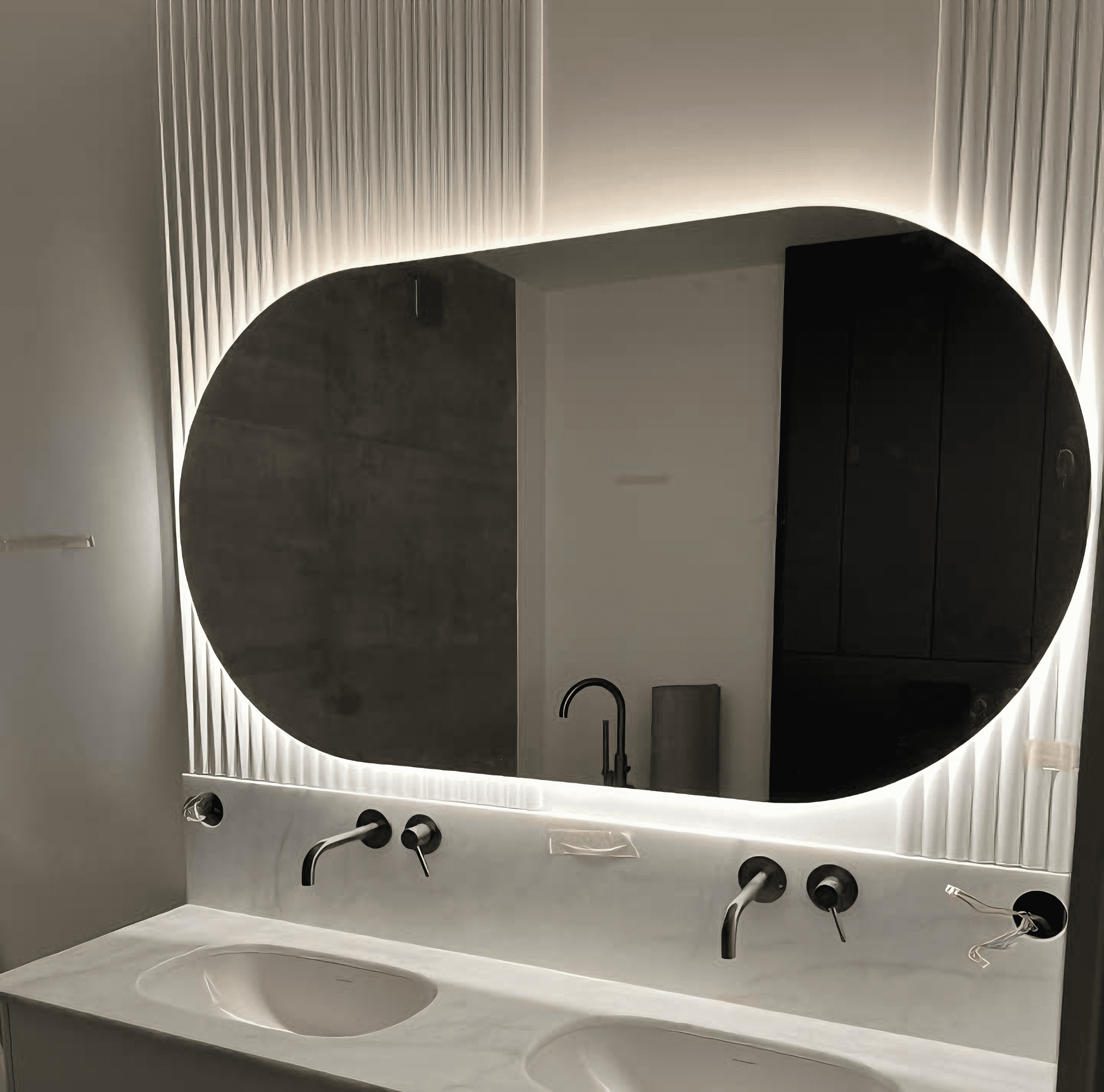 Tył lustra: standardowo niezabudowany – dzięki temu podświetlenie tworzy delikatną poświatę wokół tafli, dodając wnętrzu lekkości i elegancji.