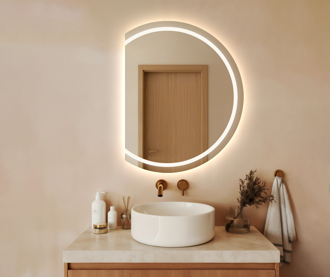 Tył lustra: standardowo niezabudowany – dzięki temu podświetlenie tworzy delikatną poświatę wokół tafli, dodając wnętrzu lekkości i elegancji.