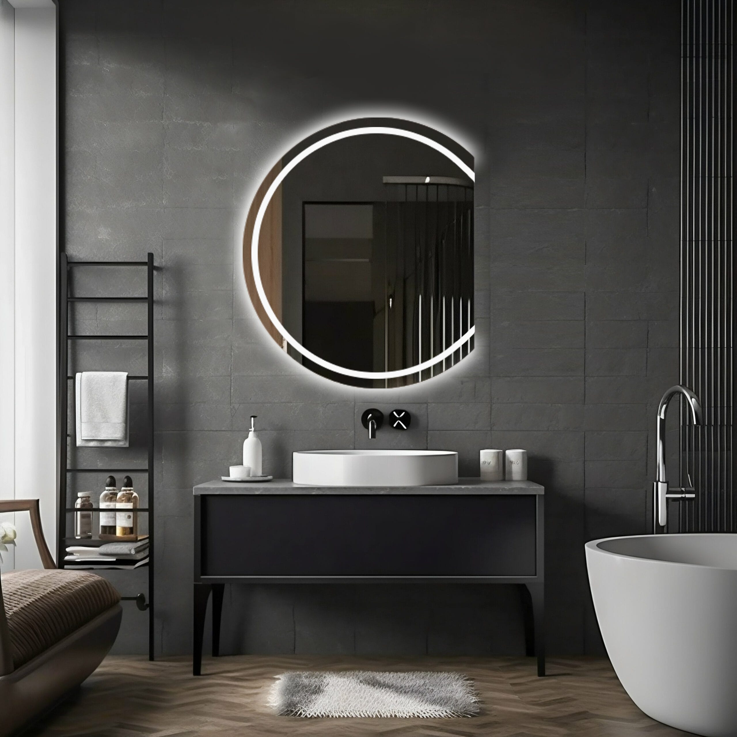 Nowoczesne wnętrza kochają niebanalne rozwiązania. Lustro LED EZEHIEL ze ściętym bokiem i dekoracyjnym piaskowaniem to idealny wybór dla tych, którzy szukają czegoś więcej niż klasycznej formy.