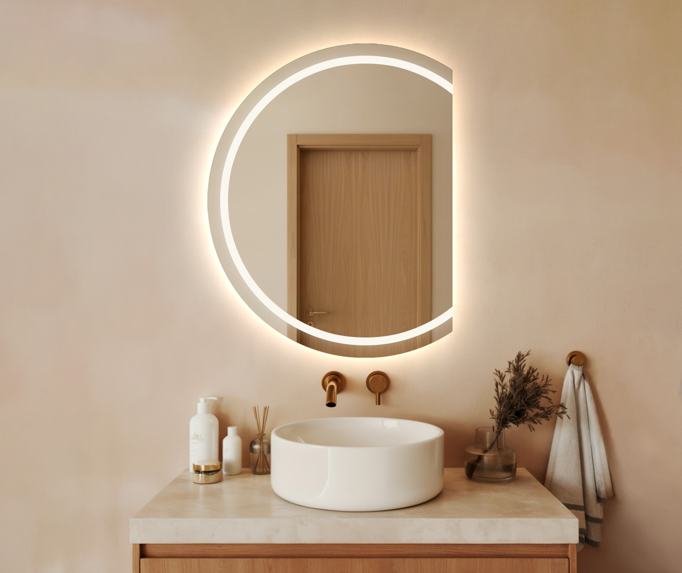 Tył lustra: standardowo niezabudowany – dzięki temu podświetlenie tworzy delikatną poświatę wokół tafli, dodając wnętrzu lekkości i elegancji.