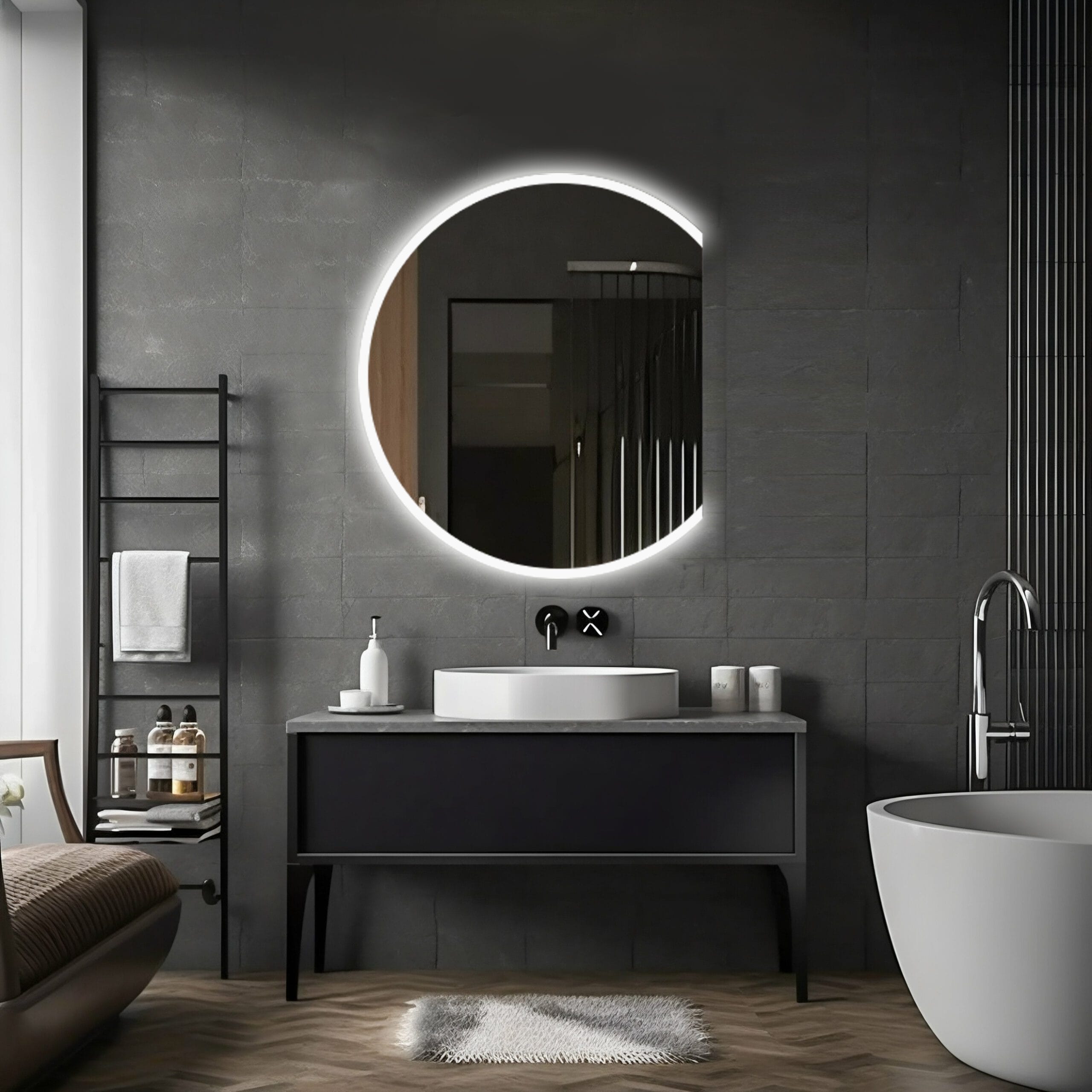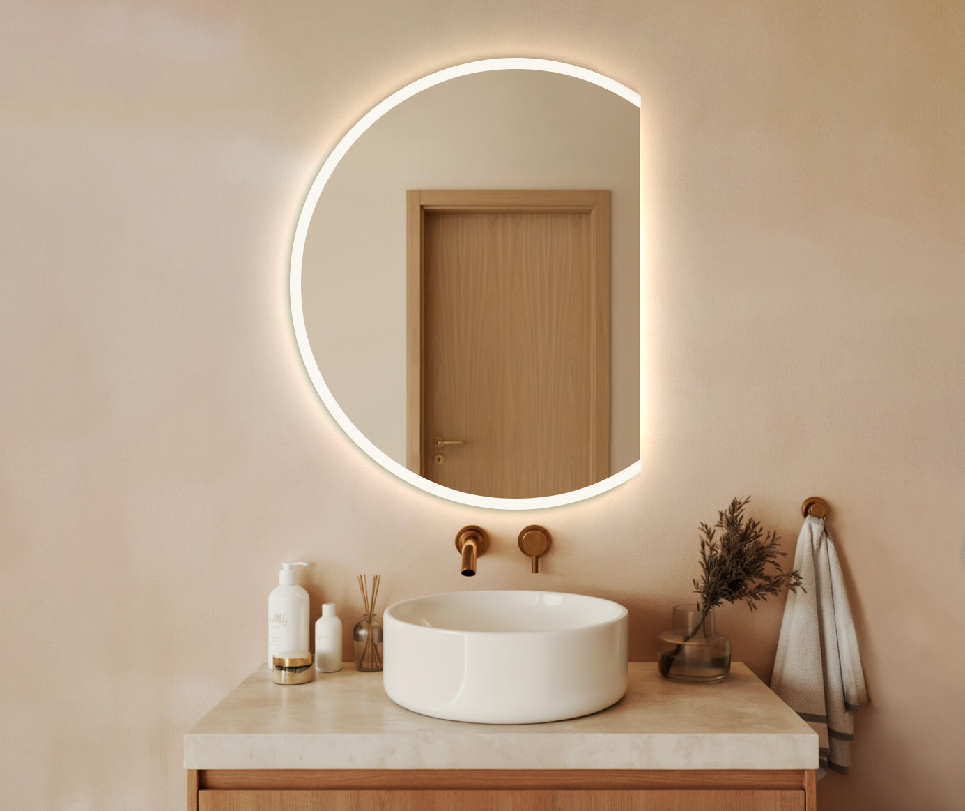 Tył lustra: standardowo niezabudowany – dzięki temu podświetlenie tworzy delikatną poświatę wokół tafli, dodając wnętrzu lekkości i elegancji.