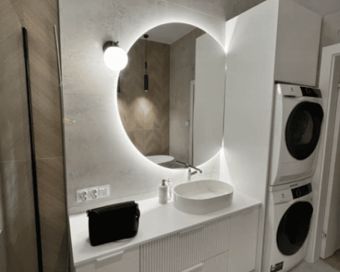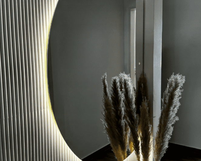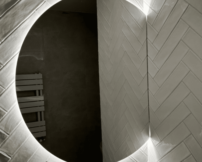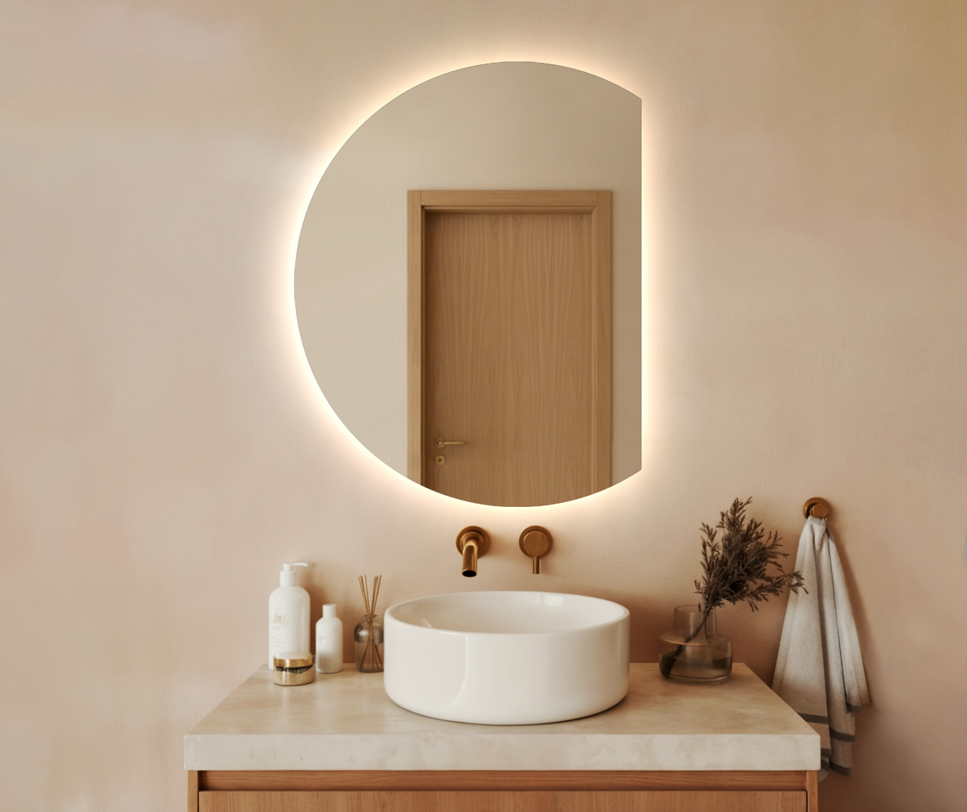 Tył lustra: standardowo niezabudowany – dzięki temu podświetlenie tworzy delikatną poświatę wokół tafli, dodając wnętrzu lekkości i elegancji.