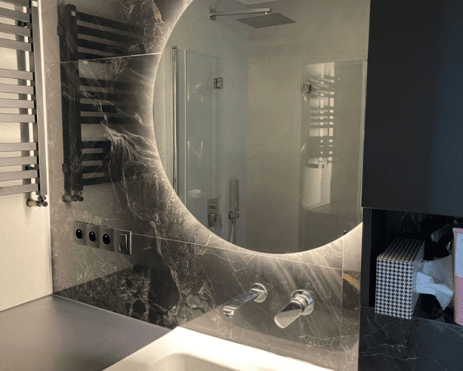 Rodzaj i grubość tafli szkła to najwyższej jakości francuska tafla SAINT GOBAIN 4mm, o jakości PREMIUM. Lustra zawierają podświetlenie LEDOWE – barwa do wyboru (Biała Ciepła 3000K / Biała Neutralna 4500K / Biała Zimna 6000K). Oświetlenie ma charakter dekoracyjny i nie zastąpi standardowego oświetlenia w pomieszczeniu.