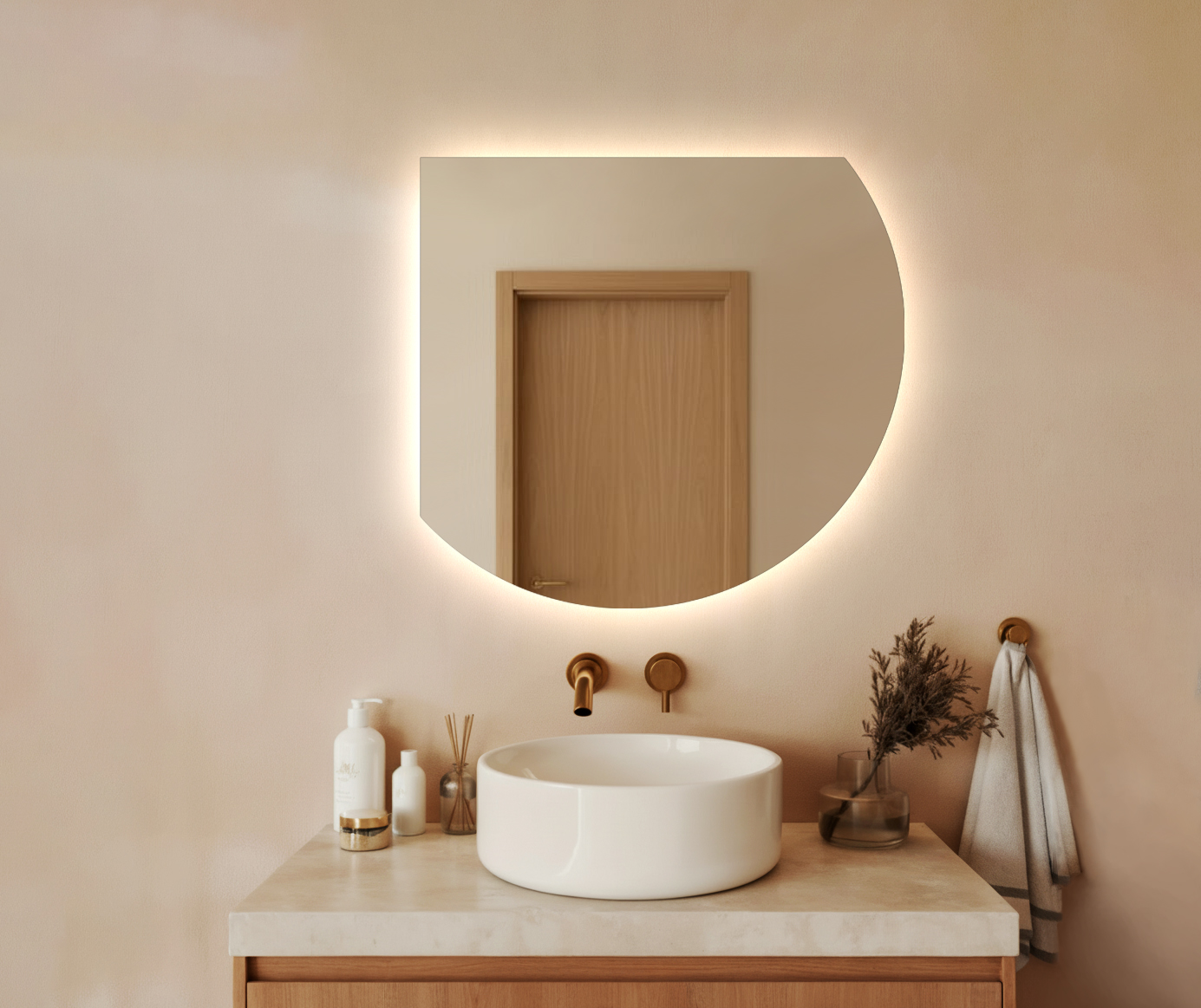 Tył lustra: standardowo niezabudowany – dzięki temu podświetlenie tworzy delikatną poświatę wokół tafli, dodając wnętrzu lekkości i elegancji.