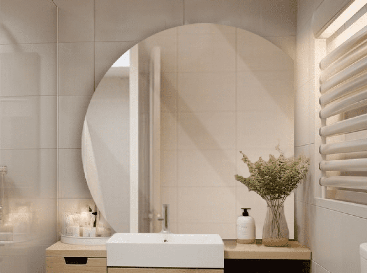 Lustro – Półokrągłe srebrne bez ramy ścięte boki bez podświetlenia (góra, prawy)